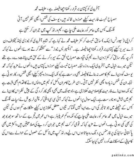 “The Board will look at Afridi’s personal performance and also how well he leads the team, as well as how he conducts himself, before deciding on whether he (Afridi) will lead the team in the World Cup.