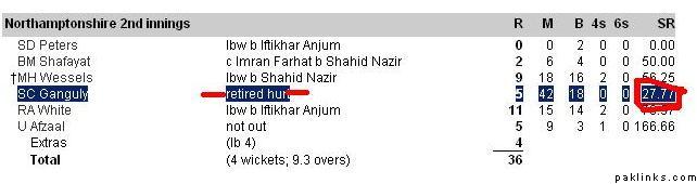 Northants 36/4 with ganguly retired hurt, so they are 5 wickets down for all intense and purposes.