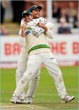 Caption: Azhar Ali is congratulated by Kamran Akmal after taking a good catch at gully to remove Graeme Swann for a duck
