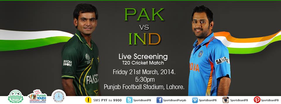 Sports Board Punjab is organizing Live Screening of Pakistan vs India T20 Cricket World Cup Match on Friday 21st March 2014, 5:30pm at Punjab Football Stadium, Ferozpur Road, Lahore.
