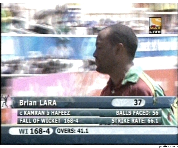 Lara gone. Akmal takes a good low catch. Hafeez strikes.