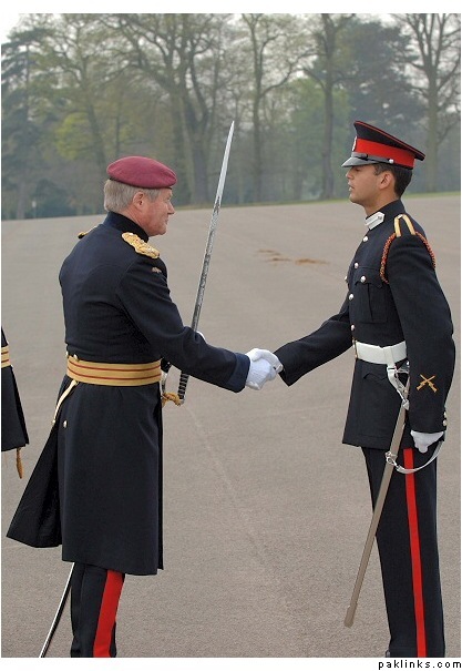 JUO Uqbah Hameed at the 153rd Sovereign’s Parade for the 62nd Commissioning Course RMA Sandhusrt shaking hands with General Sir John Reith KCB CBE, representing Her Majesty The Queen, the Reviewing Officer on Friday 13th April 2007.*