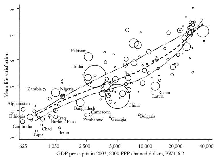 The data suggests that. One would expect to find and the analysis suggest that as per capita income of a country increases, general satisfaction with life increases with it.