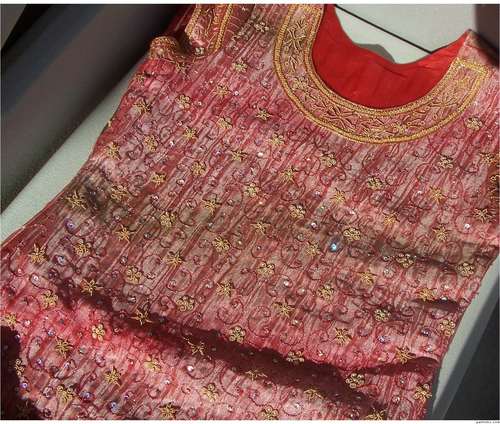 I have this two piece Designer Pinkish/Onion Reddish/Orange combination dress for sale. It has been worn only once and now it does not fit me. This dress was custom stiched and consists of a fully lined Kameez and a Shalwar/Salwar. The Kameez fabric is very high quality delicate soft crinkly tissue with self tie dye print, and the Shalwar fabric is of Katan Silk. This dress is not like those old style short Kameez and Pants style but was purposely made as a regular size Kameez and cropped pants style and looks stunning when you wear it with your high heels. The Kameez has full cap style sleeves with beautiful silma, sitaara, thread, mukesh and moti embroidary on it; the Shalwar is a lighter version than the Kameez and has extraordinary embroidary on the velvet and silk patches. The edgy design of this dress will you uniqueness among the crowd. You can pull this dress off with a Churidaar as well. This dress is very expensive and heavy and you will know it when you wear it. You will never find another piece like this one ANYWHERE because the fabric and embroidary choice is designer/boutique style. Since it does not fit me anymore, I though someone might be able to make use of it.