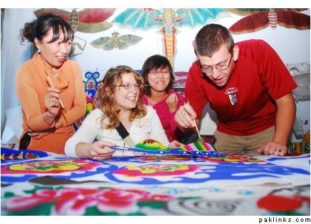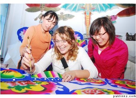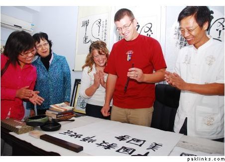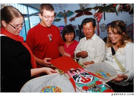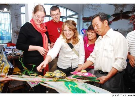 A group of foreign teachers admire Chinese kite at Weifang Painting and Calligraphy Institute in Weifang, the well-known city of kite, east China’s Shandong province