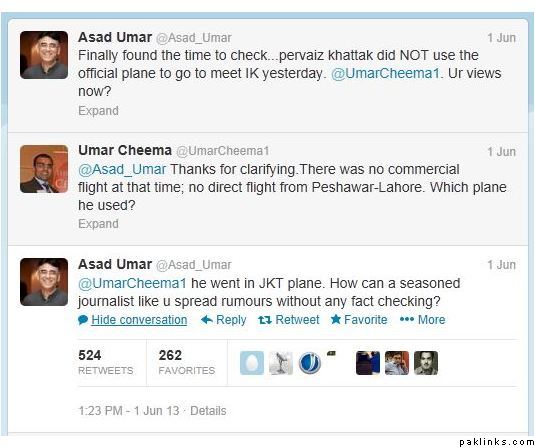 this is wht he tweeted : for all those asking if PK flew in official plane to meet IK. I dont know if its true. but if it is then it is the wrong thing to do