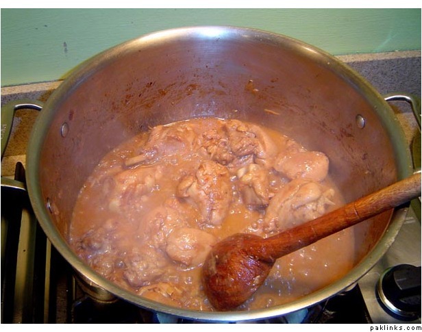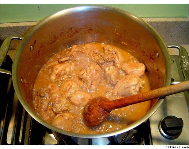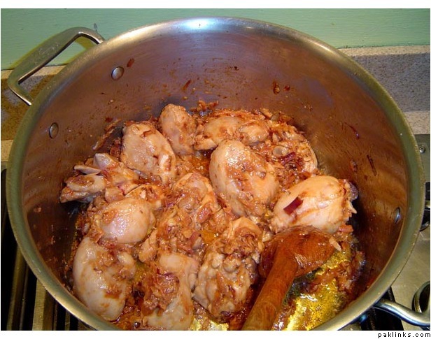 Then you stir it around so the masaala is mixed into the chicken…and saara chicken ka paani nikaltaa haiy.