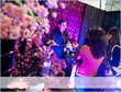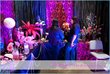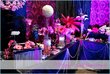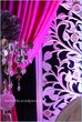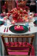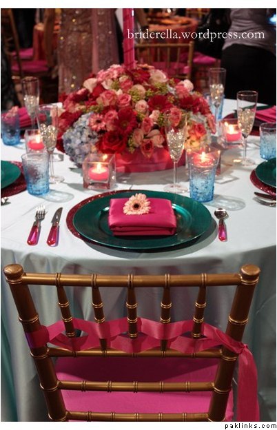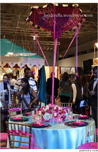 Hot pink and turquoise setup having a hanging centerpiece with an upside down umbrella as its anchor: