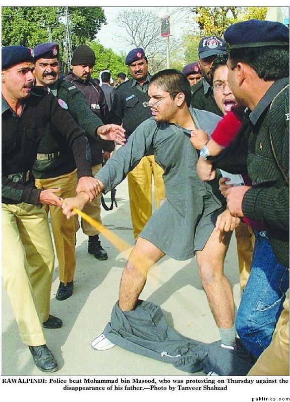 My first reaction on seeing the picture was that maybe the young man’s shalwar fell off in the scuffle. *The News *story calls it “unfortunate incident that could easily have been avoided”; Dawn,](http://dawn.com/2006/12/29/top7.htm) however, suggests that he was “stripped.” In either case, the indignity inflicted on the young man is reprehensible. Even more reprehensible is that 105 individuals are ‘missing’ without their families having any news of them.