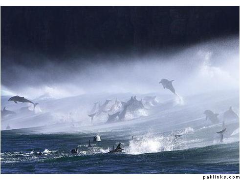 Dolphins are known to jump out the back of big waves as they break against the shores. This pod of bottlenose dolphins was leisurely surfing in the waves as the offshore wind blew against the incoming waves, creating an atmosphere that was most unique and magical. It was shot by Andrew Wong in a place called Waterfall Bluff in the Transkei, South Africa, and entered in the National Geographic International Photo Contest 2008.