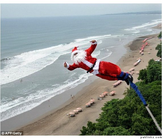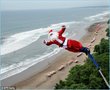 A bungee jumper dressed as Santa Claus leaps from a platform above a beach in in Kuta, Bali.