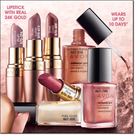 Check out Avon 24k Rose gold lipsticks,and Avon 24k gold lipsticks.