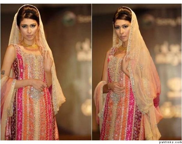 I recently went to a reception/valima where the bride wore a heavily worked long kameez with cropped pants it looked beautiful and elegant! Since it was the valima her and the groom were acting more like hosts of the event walking from table to table etc…so it worked perfectly the no fuss style…the dupata was beautiful and nicely fixed but she did not put it on her head. I think for Valima (since you are arleady hitched) its totally nice to have a more casual style and especially one that allows easier movement…There are also those “kum gher key ghararay” so I don’t know if youd’ be into that…