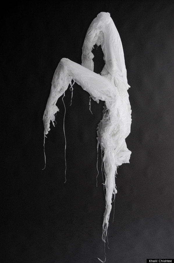 Khalil Chishtee uses loads of trash bags, unused grocery bags, plastic bags, and plastic sheets to create textured sculptures which take on a bizarre life of their own and are wracked with emotion. He uses these materials as a metaphor for “Recycling our identities” or braving the problems of life.