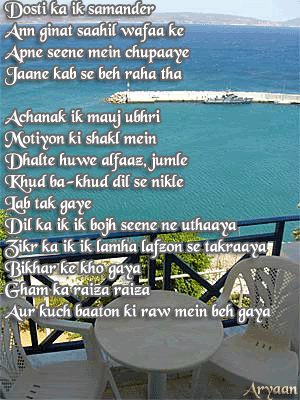 I need you’re help please. Its my best friends birthday in a couple of weeks and I wanted to make her a special card – she’s an urdu poetry fan so I wanted to know if someone can please help me find a good poem on friendship.