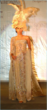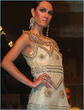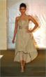 Nadia models a Maria B. cream colored dress with sequenced bead work and ribbon patterns along the waist and hips.