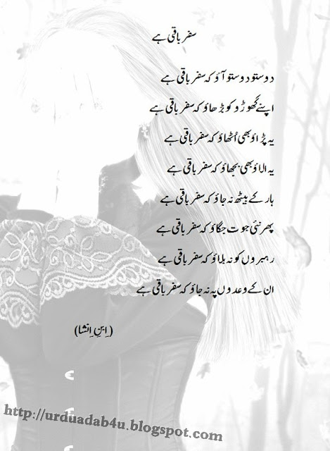 bn-e-Insha (Punjabi, Urdu: ابن انشاء) (b. 15 June, 1927 d. 11 January, 1978) was an eminent Pakistani Leftist Urdu poet, humorist, travelogue writer and columnist. Along with his poetry, he was regarded one of the best humorists of Urdu. His poetry has a distinctive diction laced with language reminiscent of Amir Khusro in its use of words and construction that is usually heard in the more earthy dialects of the Hindi-Urdu complex of languages, and his forms and poetic style is an influence on generations of young poets.