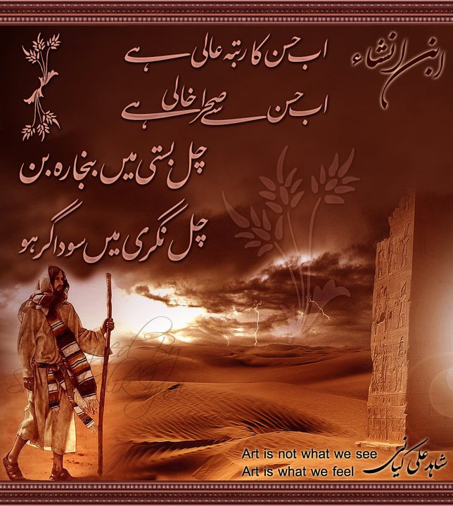 He is considered as one of the most versatile poets and writers of his generation. His most famous ghazal Insha Ji Utthoo (انشاء جی اٹھو) (Get up Insha Ji, Let’s leave from here) is a modern day Classic. His other works include a number of travelogues recorded with a distinguished touch of humour.