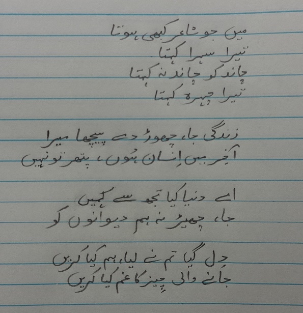 ye hand writing dekh ke mujhe Naseebo Laal ka ek gana yaad aa gay.. 11C ki bus main suna tha… Nasib Sade Likhe RAb NE Kachhi pencil NAal . kachi pencil naal likhya
