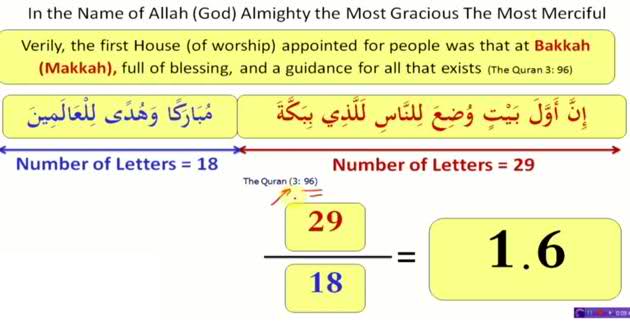 If we count the arabic words in this verse from begining till word “Bakkah (Makkah)” than there are total **29 **words and rest verse till end than there are only 18 words. If we divide both numbers **29 / 18 **than we get the answer 1.6. The golden ratio (Golden ratio - Wikipedia, the free encyclopedia) of Makka in the world is 12348,32 / 7631,68 = 1,618…