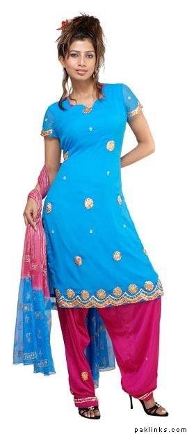 I really dislike patiala shalwars, but this is tooo much!! eew. They are trying to make it look fashionably modern for girls who want to have a bit of a western look.(Overkill) Even a Western girl would never wear this. When I saw how "in" short kurtas with shalwar/pajamas were around eight-ten years ago I asked myself "Can they and will they get any shorter?" and this pic proves it can. My grandma said shorter kurtas with pajamas and shalwars were okay as long as they didn't look like American size tops girls wear at school/going out etc as in like this picture!!