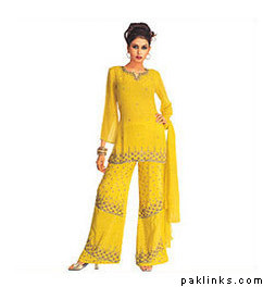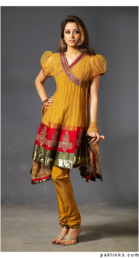 I really dislike patiala shalwars, but this is tooo much!! eew. They are trying to make it look fashionably modern for girls who want to have a bit of a western look.(Overkill) Even a Western girl would never wear this. When I saw how “in” short kurtas with shalwar/pajamas were around eight-ten years ago I asked myself “Can they and will they get any shorter?” and this pic proves it can. My grandma said shorter kurtas with pajamas and shalwars were okay as long as they didn’t look like American size tops girls wear at school/going out etc as in like this picture!!
