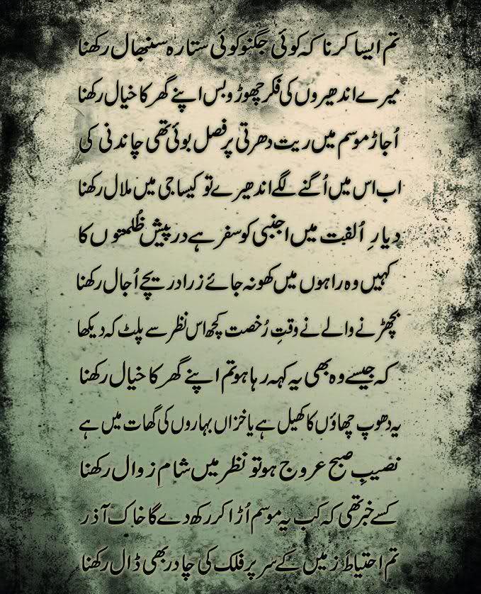 ** ** ** Yeh Dhoop Chaao'n Ka Khel Hai Ya Khizaa'n Bahaaro'n Ki Ghaat Mein Hai Naseeb-e-Subh Ujrooj Ho To Nazar Mein Shaam-e-Zawaal Rakhna