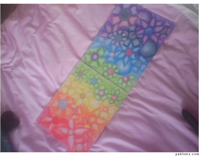 I used watercolours, pencils and pastel chalks. I used white cardboard as background. I split it into 7 sections, for each colour, and used the chalks to colour in the blocks. Then I got more cardboard and drew on different shaped flowers and circles. Coloured them in using pencil and water colours and stuck them onto the background:@: