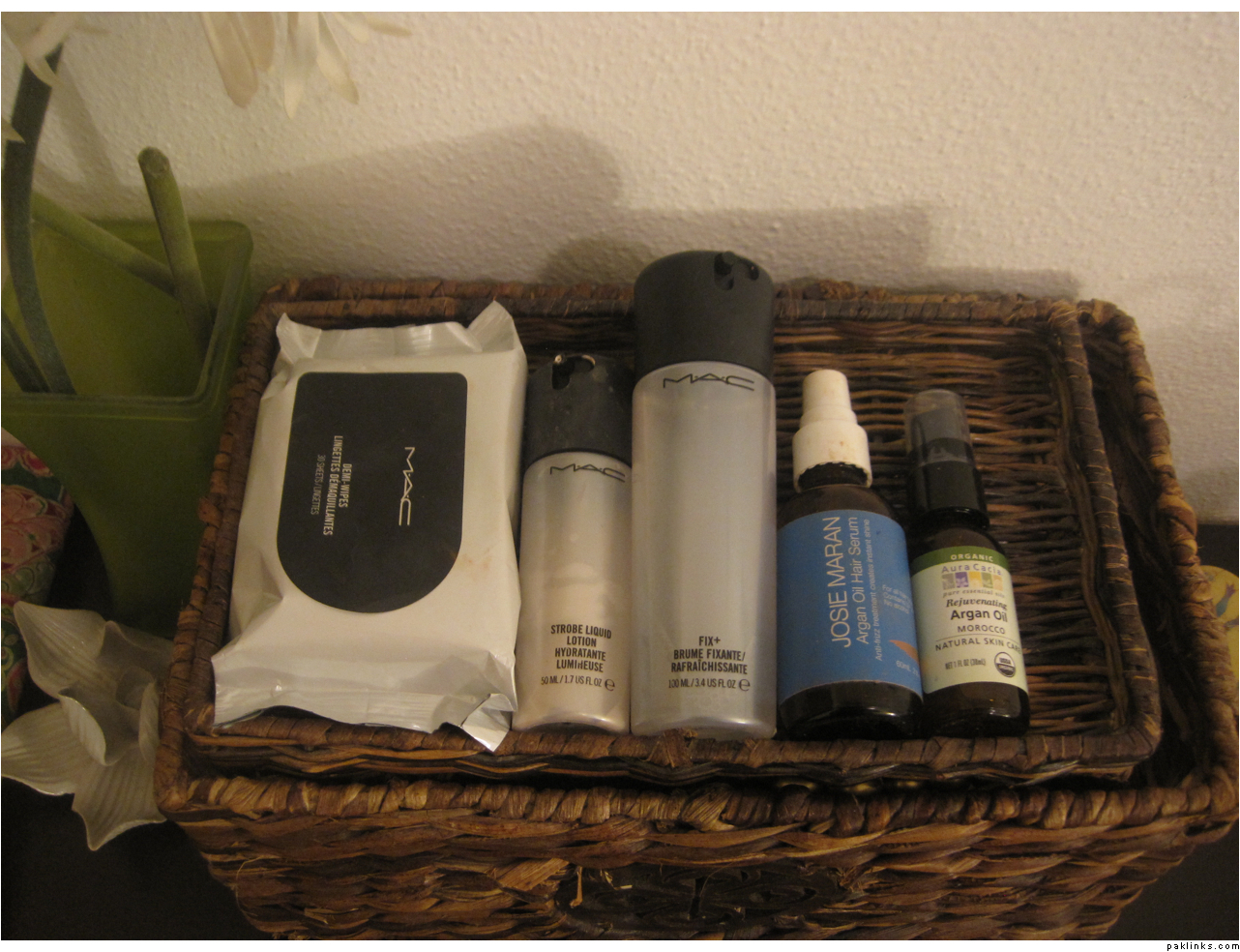 Extra Stuff (I use Aragon oil for cleaning make-up too), Mac fix plus for setting and Mac strobe for highlighting