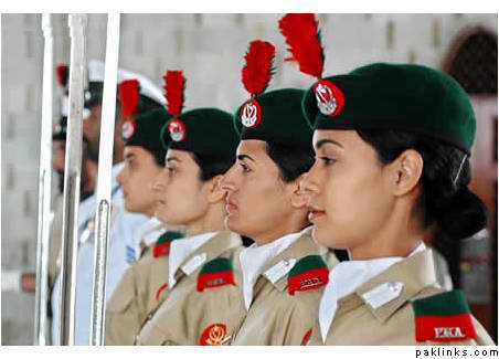 Female cadets of Pakistan Military Academy (PMA) Kakul stand guard at Quaid-e-Azam’s mausoleum.