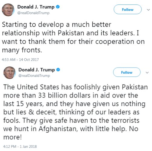 The United States has foolishly given Pakistan more than 33 billion dollars in aid over the last 15 years, and they have given us nothing but lies & deceit, thinking of our leaders as fools. They give safe haven to the terrorists we hunt in Afghanistan, with little help. No more!