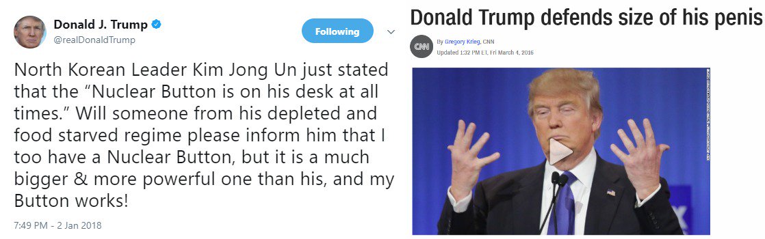 In last 24 hours Trump has threatened to 1) cut aid to nuclear-armed, terrorist-laden Pakistan; 2) cut aid to miffed Palestinians after he alters US Jerusalem policy, and 3) boasted his nuclear button is bigger than Kim Jung-un’s. This is our commander-in-chief. Think about it.