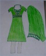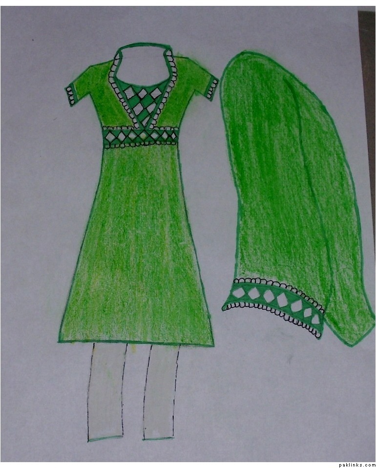 I didn’t have my paints so I couldn’t quite get the colors I wanted to. Anyhow, on the shirt, the base color is same, the green of the top looks kind of different but it is supposed to be the same as the body. It is a simple long shirt with bead work both on the shirt and dupatta. Straight pants with green piping at the botton. I have to think a little bit more about the fabric. I think it will be something like jamavar or chiffon or silk. My vision is of unity that is why I have selected the close bead work. The two greens and white represent different colors of pakistan closely knitted. I think it should convey the feeling of freedom, prosperity, success, and peace. (This can only happen when keep our differences behind and unite for a cause.)