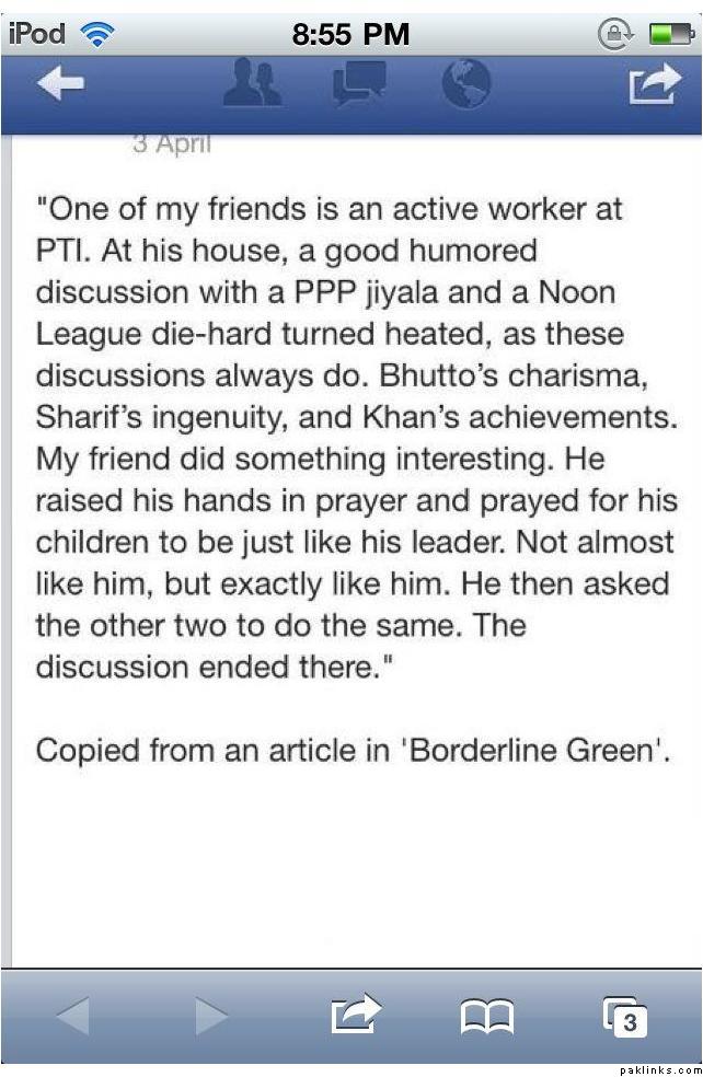 Good touching post yazdi. After seeing the country going down the drain due to the incompetence of the two bigger parties, there is some light at the end of the tunnel. Imran Khan not only has support among the youth (educated) within the country but also abroad. He is the only person at present who can utilize the pool of best people available to turn the country around. As far as Imran is concerned he alredy has wealth and fame, now if he gets a chance he really wants to do something for the country (like Mahatir or Erdogan).