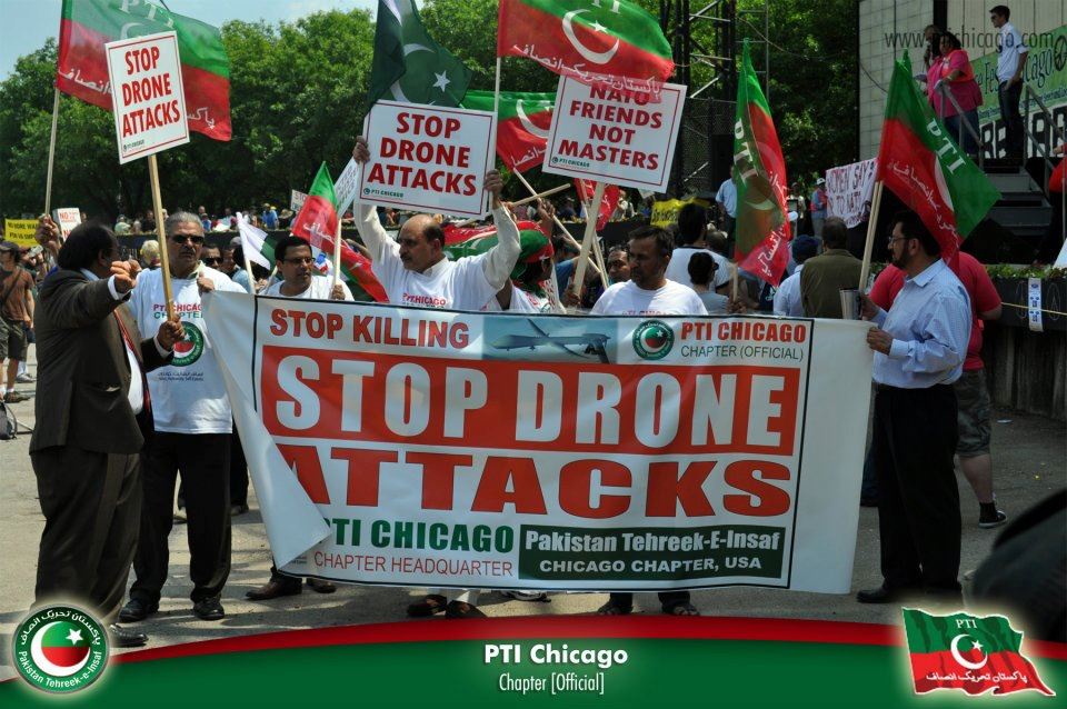 PTI Chicago Chapter joined hands with fellow American’s to protest against NATO in Downtown Chicago. Thousands of Americans were out on the streets protesting against the atrocious killing of innocent Pakistanis at the hands of Drone attacks. We stand united with our Chairman Imran Khan (official) in his stand against the Drone attacks in Pakistan and will continue to work to stop the killing of innocent Pakistani’s and to help stop and close permanently the NATO Supply route that our government has now opened up.