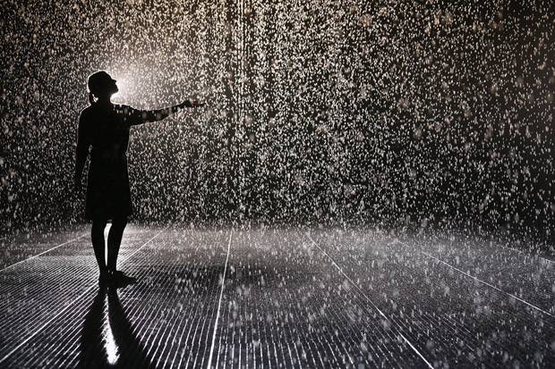Rain Room by Random International is a new installation at the Barbican in London (free until March 2013). Rain Room tracks visitors’ movements as they step into a precise, 100 square metre cuboid torrent of water and, somehow, remain dry. How exactly this is done is a mystery, despite Random’s list of the tools of its trade, including injection moulded tiles, solenoid valves, pressure regulators and 3D tracking cameras.