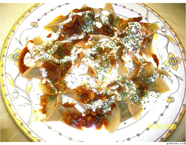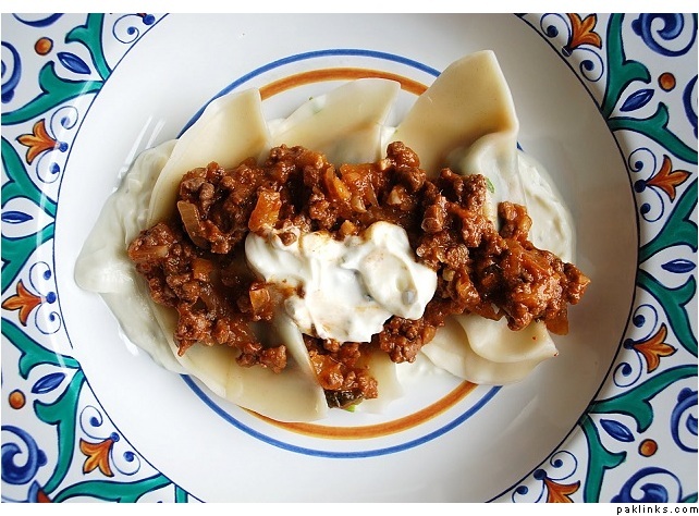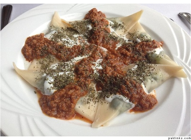 Aushak – Dumplings similar to mantoo which are with filled with scallions and lamb (or beef) served with a meat sauce and topped with yoghurt and mint. These differ from mantoo in that they are boiled rather than steamed.