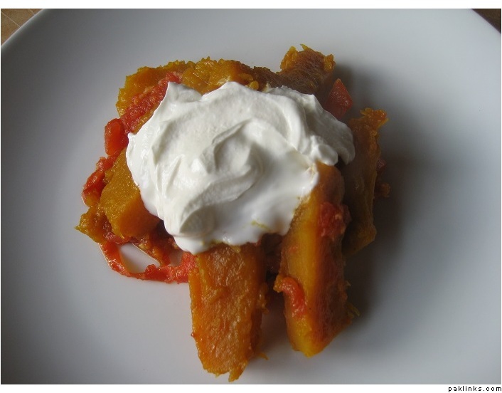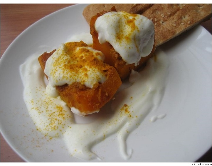 Borani kadu – Braised pumpkin in a sweet tomato and onion gravy with a hint of spice topped with yoghurt.