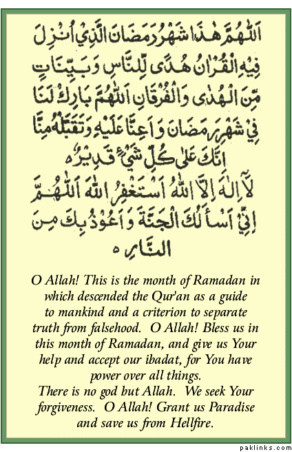 **O Allah ! Bless us in this month of Ramadan , and give us Your Help and accept our ibadat, for You have power over all things. There is no god but Allah . We seek Your forgiveness . **