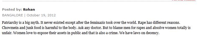 I hear from a source in India than some people are blaming the girl for the rape and saying what was she doing out late at night watching a movie with a male friend. That the rape was a punishment for the girl.