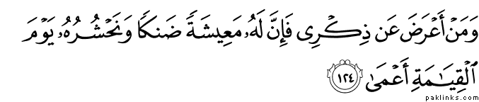 **Translation: **But whosoever turns away from my message, verily for him is a life Narrowed Down, We Shall raise Him blind on the Day of Judgement.