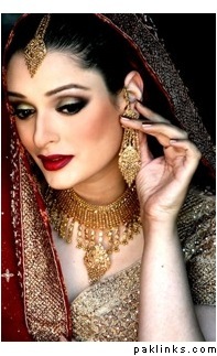 With a heavy red saree full of gold kaam, what kind of makeup would look good? Dark smokey eyes with pale lips? Gold eyes and red lips? Any other ideas?