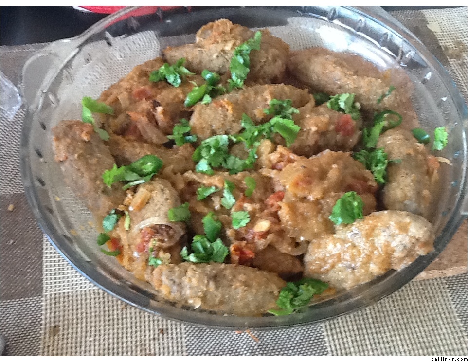 Cut other 2 onion and tomatoes in cubes. Layer in on the kababs and leave them with ample water and cover pot with lid for 10 minutes. When you see that onion and tomatoes are well tendered and mixed, then add some coriander leaves and green chillies.