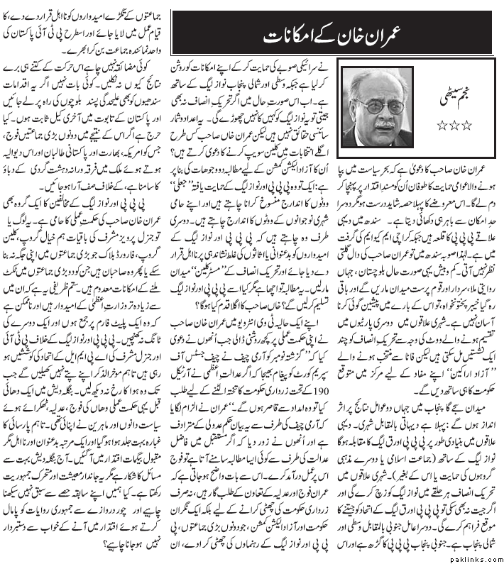 Good post Desert Bird. How can he beat persons like Javed Hashmi or Khawaja Safdar of PML(N)? PML(N) is lucky to have these people. Sincere and dedicated person like Javed Hashmi is fit to work as PM or president of Pakistan. IK can only dream beating star politicians wheather they belong to PPP or PML(N) in impartial elections.