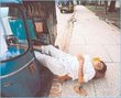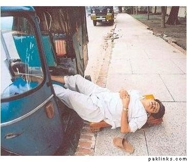 Why am I being accused of making fun of the guy for being a rikshaw wala? I find it funny how he put his legs in the rickshaw so nobody would take it while he's sleeping. It's creative. I'm not making fun of the guys quality of life for God's sake.