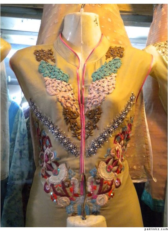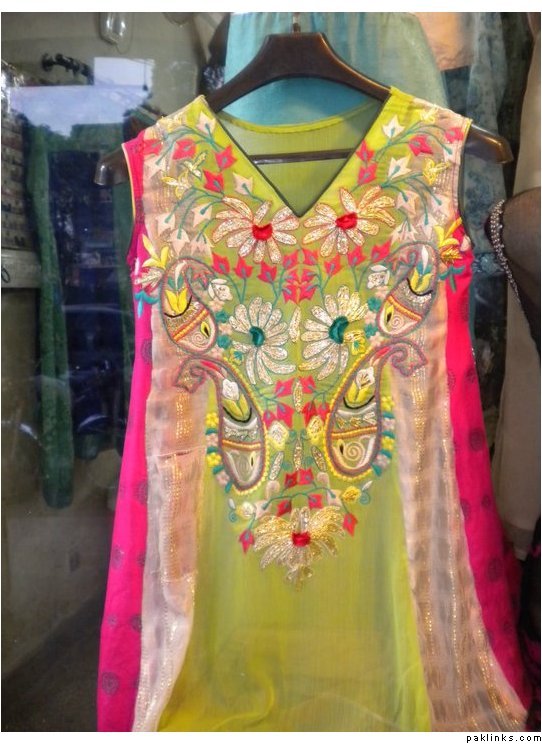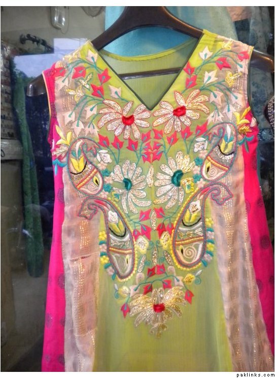 outfit 1 , 3 piece suit including stitching, colors can be changed to your wishes and sleeves can be added PkR 13,000 (including shalwar/trouser and dupatta