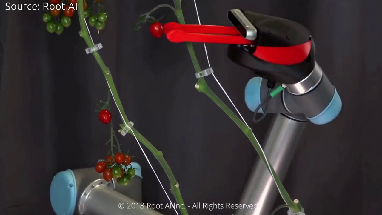 A startup named “Root AI” is working on develping a Robot for picking vegetables in Indoor farms. The first product from Root AI is a mobile robot that operates in indoor farming facilities. It picks tomatoes and is able to look at crops and assess their health, and conduct simple operations like pruning vines and observing and controlling ripening profiles so that the robot can cultivate crops (initially tomatoes) continuously and more effectively than people.