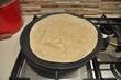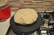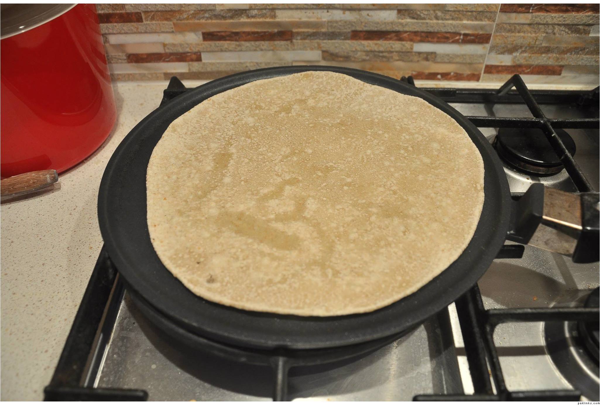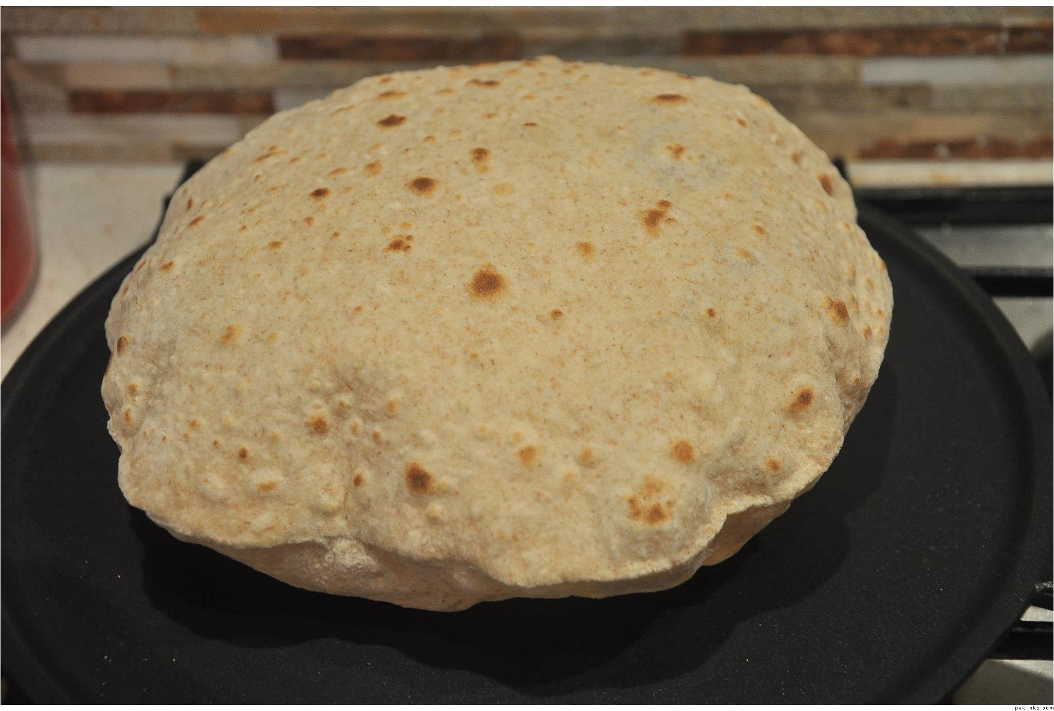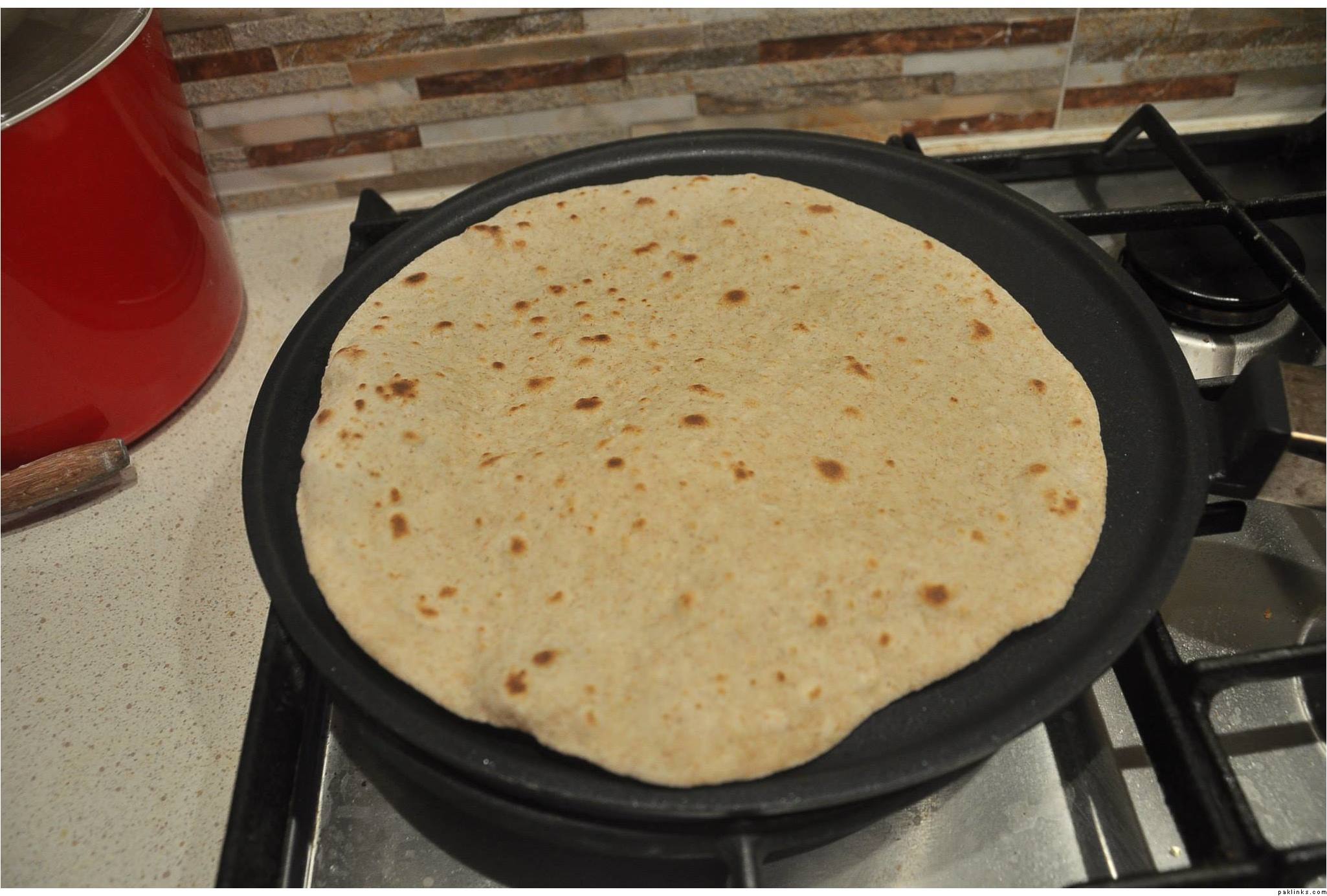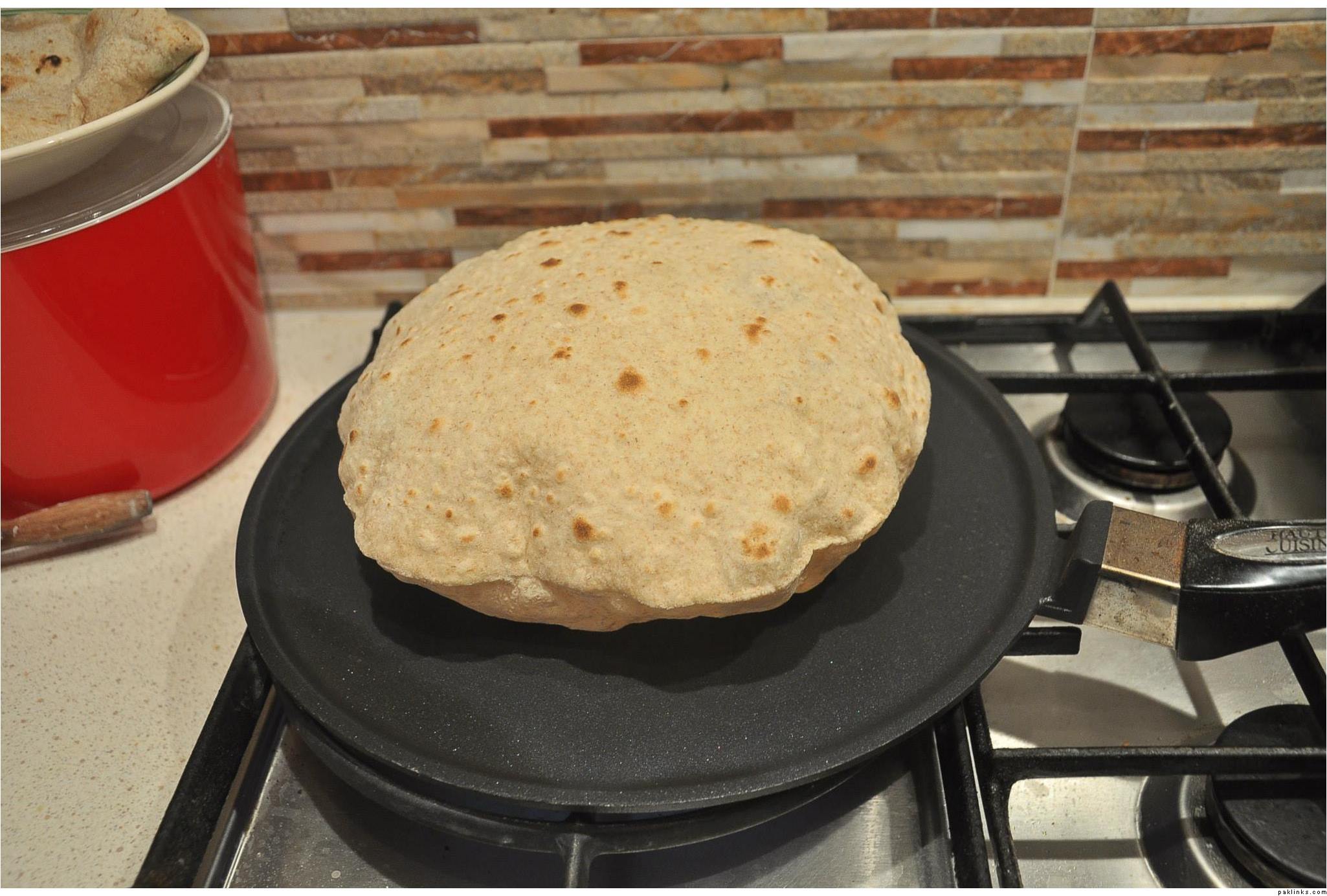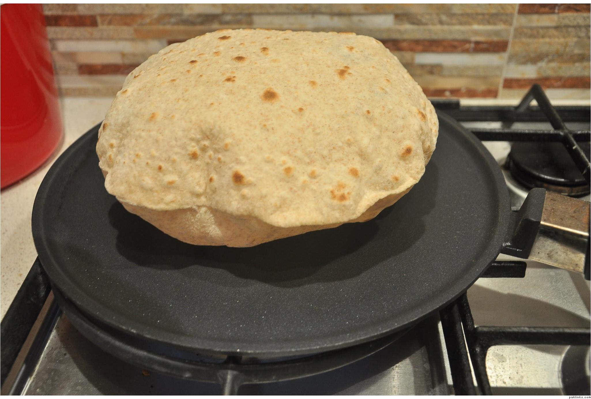So make a pera, flat it out in a round shape with your belan. Your tawa should be hot, and put the roti on your tawa. When it’s half cooked, flip it, let it cook on the other side(when you see small bubbles), flip it again. Now take a tea towel and fold it in a ball like shape, and slightly press the roti. And your roti will puff up like in the pix