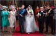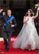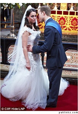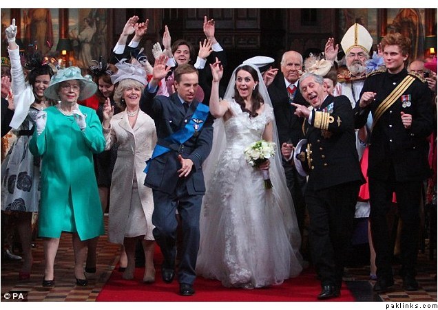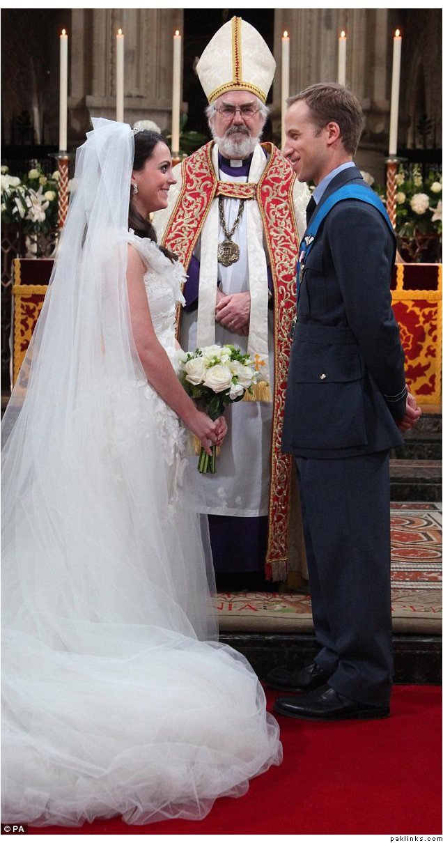 ‘William’ and ‘Kate’ exchange their vows infront of an Archbishop of Canterbury look-a-like and ‘Kate’ looks decidedly unimpressed by her husband’s advances when he goes in to kiss the bride.