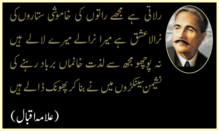 **رلاتی ہے مجھے راتوں کی خاموشی ستاروں کی نرالا عشق ہے میرا نرالے میرے لالے ہیں نہ پوچھو مجھ سے لذتِ خانماں برباد رہنے کی نشیمن سینکڑوں میں نے بنا کر پھونک ڈالے ہیں (علامہ اقبال)